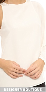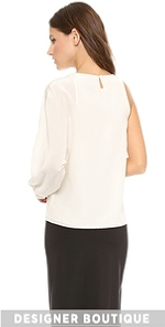 A silk Cynthia Rowley blouse with striking asymmetry. A ruched buttoned cuff secures the single dolman sleeve. Buttoned keyhole. Lined.