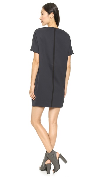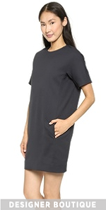 A simple minimalist shift dress by Vince crafted in mid-weight crepe. On-seam hip pockets and casual crew neckline. Short sleeves. Hidden back zip. Lined.