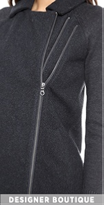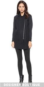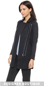 Brushed felt and wool knit create a sophisticated-meets-comfy silhouette on this Joie coat. Fold-over collar and zip placket. A faux-zip parallels the closure for an edgy look. Knit sleeves and back panel create a close cozy fit. Welt front pockets. Exposed zips close the cuffs. Unlined.