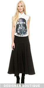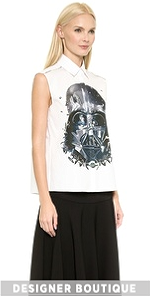 This crisp Preen by Thornton Bregazzi blouse has a hit of pop-culture charm. A detailed Darth Vader graphic details the front and Star Wars™ accents lend a playful finish. Button placket. Sleeveless.