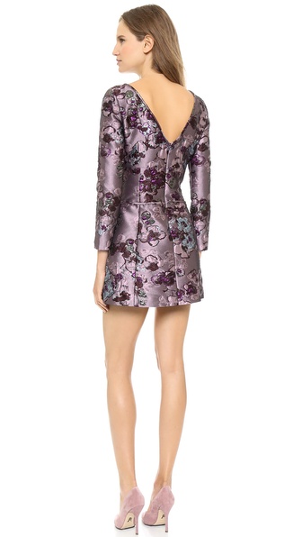 This striking Nina Ricci dress is crafted in rich metallic brocade lending ornate charm to the feminine silhouette. Deep pleats sculpt the skirt. Slant hip pockets. The wide neckline dips into a chic V back. Long sleeves. Lined.