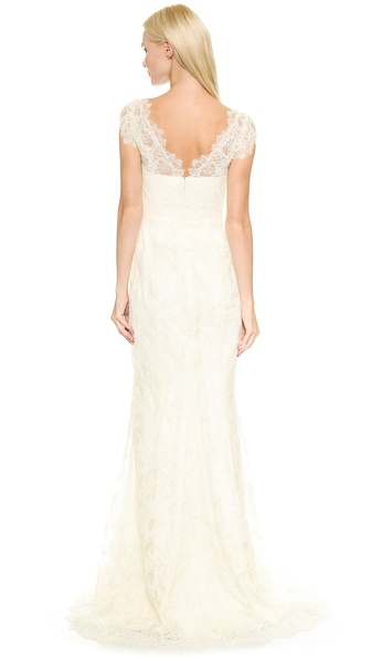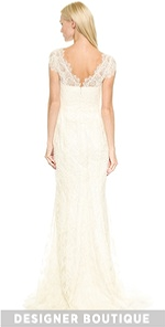 A romantic lace Marchesa gown with delicate scalloped edges and feminine cap sleeves. The portrait neckline reveals an elegant swath of skin and the boned bodice is lined with optional push-up padding. Elegant mermaid hem. Hidden back zip. Fully lined.