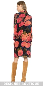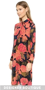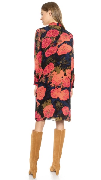 Bold floral patterns play throughout this silk Jenni Kayne shirtdress lending a festive element to the casual silhouette. Hidden buttons fasten the half-placket and buttoned cuffs finish the long sleeves. Fold-over collar. Lined.
