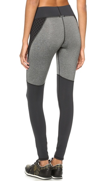 These texture-rich MICHI leggings have curved mesh panels at the hips. Overlock seams accentuate the paneled construction and a wide elastic waist provides a comfortable flattering fit.