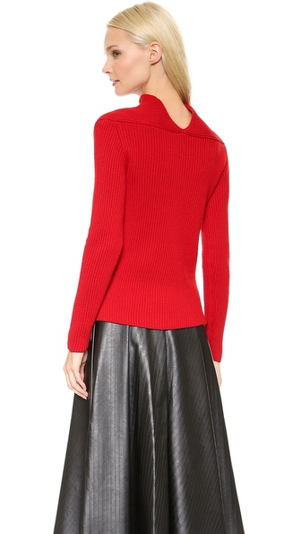 Ribbed-knit construction lends a figure-hugging fit to a casual J.W. Anderson sweater. The high neckline angles to a shallow V back and inverted stripes accent the yoke. Long sleeves.