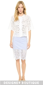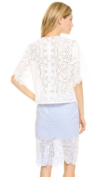 A breezy eyelet Jenni Kayne blouse with a boxy profile. Collarless neckline and hidden-button placket. Elbow-length sleeves with scalloped edges. Sheer.