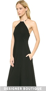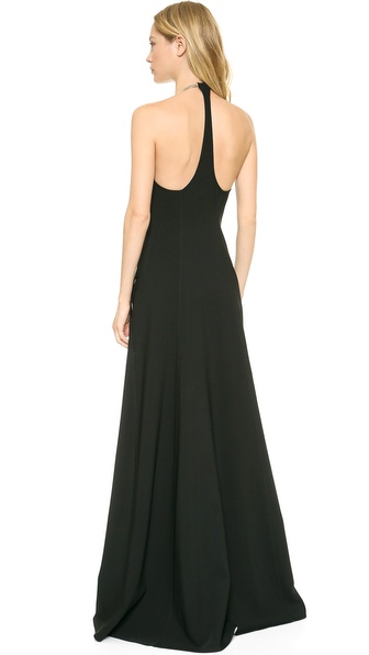 A sleek polished metal ring lends futuristic drama to this Kaufman Franco gown. This striking silhouette is detailed with a split panel in front yielding an easy drape through the floor-length skirt. On-seam pockets. Halter neckline and slim racer back. Hidden side zip.