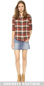 A frayed hem lends a hand-finished look to a soft faded denim MOTHER miniskirt. Whiskering and shredded holes. 5-pocket styling. Button fly. Unlined.