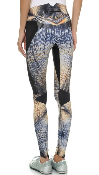 A brilliant print contrasts with vented panels on these Lucas Hugh leggings. Wide waistband and V cutout at the spine. Zipper key pocket at back. Ankle zips.