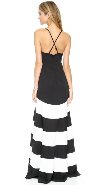 Bold chevron stripes add a crisp graphic element to a flowing crepe Shoshanna gown. The fitted bodice is styled with a simple square neckline and adjustable crisscross straps. Hidden back zip. Lined.