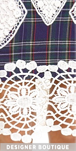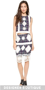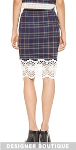 Tartan plaid mixes with crocheted cutouts on this fitted endless rose pencil skirt. Intricate lace lends a sheer element at the hem. Hidden side zip. Crepe lining.