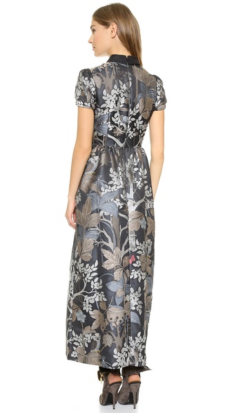 A petite peter pan collar and short puffed sleeves lend a sweet feel to this forest-print RED Valentino maxi dress. Ruching adds volume to the skirt. On-seam hip pockets. Hidden back zip. Unlined.