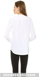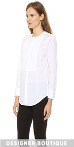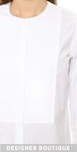 A scale-textured panel frames the covered button placket on a minimalist Theory blouse. Smooth collarless neckline and shirttail hem. Long sleeves.