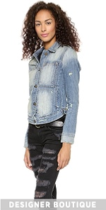 Shredded denim lends worn-in appeal to a vintage-inspired McGuire Denim jacket. Antiqued buttons fasten the single-breasted placket and epaulets and 4 pockets detail the front. Buckle tabs adjust the fit. Curved hem. Long sleeves. Unlined.