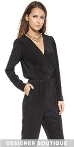 This silky Rory Beca jumpsuit has a plunging surplice neckline with a self-belt tie. Pintucked seams lift the shoulders and inset elastic defines the waist. Hidden snap-button closure and zip fly. On-seam pockets. Long sleeves.