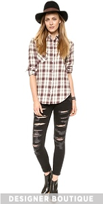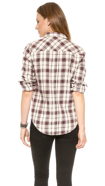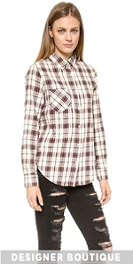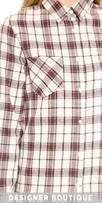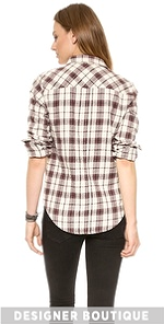A plaid ANINE BING shirt has laid-back appeal in classic flannel. Patch breast pocket and fold-over collar. Button placket and cuffs. Shirttail hem. Long sleeves.