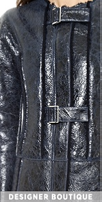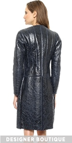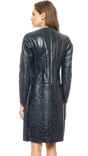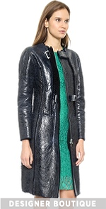 Crackled patent shearling brings a rich striking finish to this Nina Ricci coat. Buckled straps secure the 2-way front zip and on-seam pockets lay at the sides. Seamed back panel. Long sleeves. Napped wool backing.