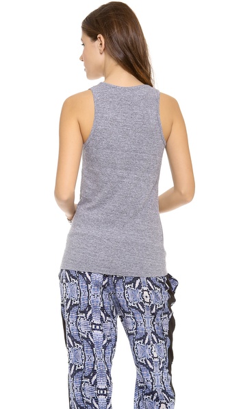 A racer-back tank in a long lean silhouette with a low scoop neck and a subtly twisted hemline.