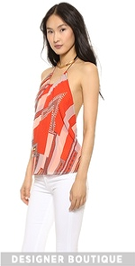 A drawstring neckline creates delicate ruching on a fluid silk-chiffon Ramy Brook top. The halter straps and knotted hem secure the alluring open back. Sleeveless.
