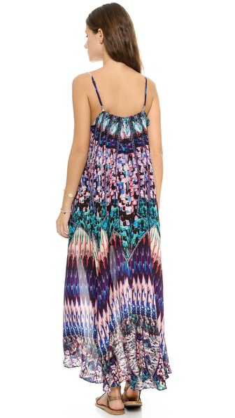 A vivid Camilla mini dress has a wrap-inspired silhouette with a flowing back overlay and self-ties. Adjustable straps trace the shoulders and fused crystals sparkle below the neckline. Unlined.