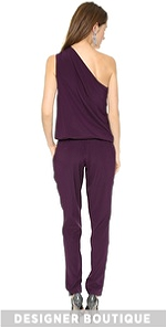 Pleats taper into soft draped curves along the bodice of an elegant one-shoulder jumpsuit cut from smooth silk charmeuse. Scooped hip pockets sit below the gathered elastic waist. Hidden side zip.