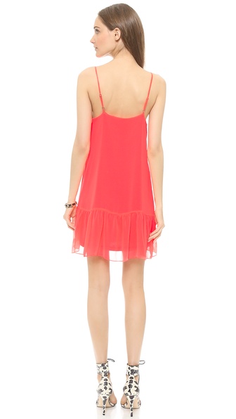 A neon hue brings cheery personality to this Rory Beca mini dress. The swingy V-neck profile has a ruched flounce for a flirty finish. Adjustable spaghetti straps. Jersey lining.