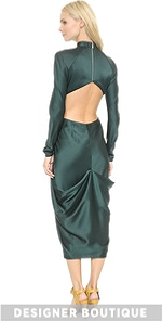 Textured sateen lends a fluid hand to this pleated Jason Wu dress. Waist cutouts lend a seductive element to the sophisticated silhouette and a sleek metal tie bar accents the front. High neckline. Exposed zip at cutout back. Hidden side zip. Long sleeves. Unlined.
