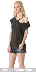 The classic tee gets a grunge revamp in the hands of LNA. A frayed rip details the shoulder and tonal whipstitching finishes the cuffs. Semi-sheer.