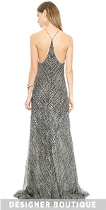 A herringbone trompe l'oeil pattern lends vintage appeal to this sexy silk Kaufman Franco gown which is fashioned with a revealing racer back and delicate spaghetti straps. V neckline. Back slit. Self-lined.