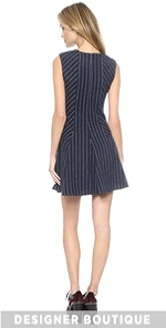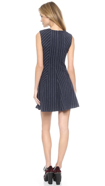 Asymmetrical seams and pinstripes bring a geometrical element to this sleeveless JOA dress. Deep side pleats add a flouncy finish. Hidden back zip. Lined.