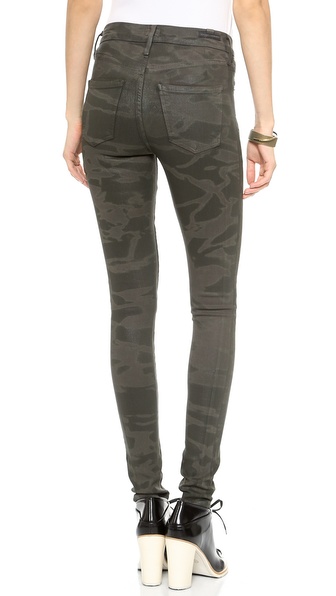 These slinky camo-patterned skinny jeans are cut from soft super-stretch denim yielding a sleek comfortable fit. Flattering mid-rise. 5-pocket styling. Button closure and zip fly.
