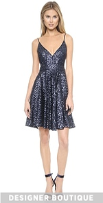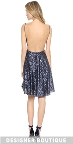 Allover sequins give this dress a glamorous textured effect. A deep V neckline and open back keep the look flirtatious. Hidden side zip. Lined.