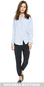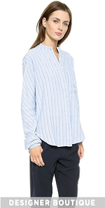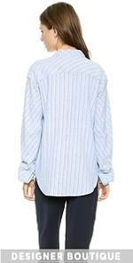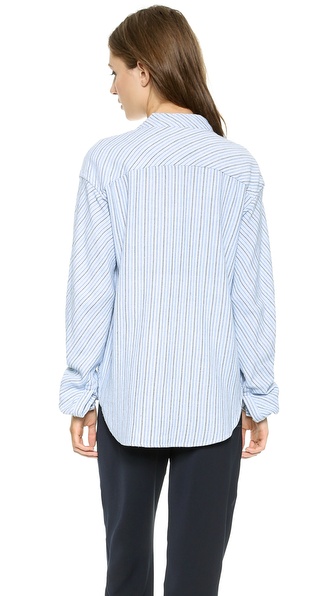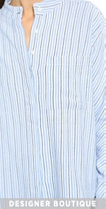 Menswear-inspired Laurence Dolige button-down shirt rendered in an intricate woven stripe. A slouchy oversized silhouette creates an effortless look. Covered button placket. Long sleeves and button cuffs. Patch pocket. Shirttail hem and Mandarin collar.