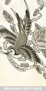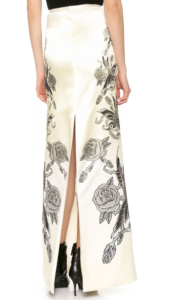 Tattoo-inspired bird graphics and 'bluebirds' lettering lend edgy feminine appeal to a rich satin Sally LaPointe skirt. A high back slit offers a peek of leg relaxing the A-line silhouette. High waist. Hidden back zip. Lined.