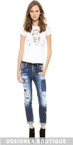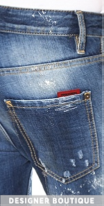 Dirty scuffs paint splatters and worn fading lend a cool well-traveled feel to these DSQUARED2 Cool Girl jeans which are cut in a slouchy slim silhouette. Patched detailing lends a favorite-denim element. 5-pocket styling. Button fly.