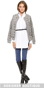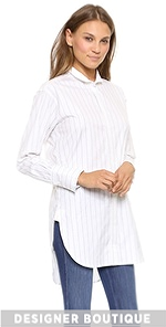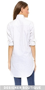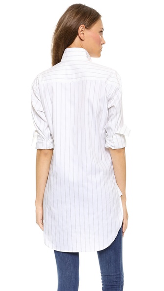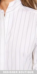 Tonal jacquard embroidery adds subtle detail to this striped By Malene Birger blouse rendered in a loose elongated profile. Hidden buttons close the placket and slits relax the shirttail hem. Buttoned cuffs and long sleeves.