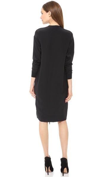 This silk By Malene Birger shirtdress has tonal fringe along the hidden button placket. Ribbed banding at the cuffs add a modern finish. Long sleeves. Unlined.