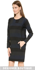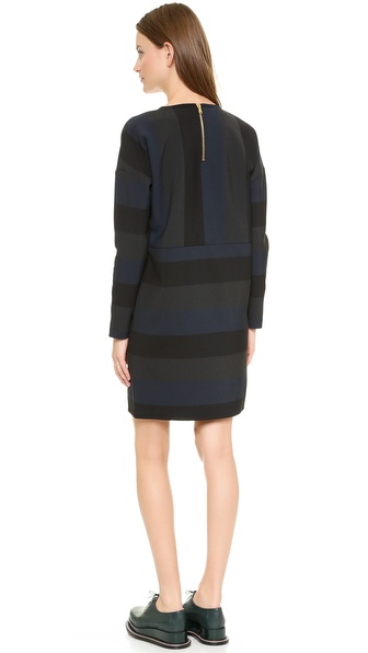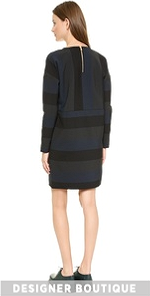 A simple Lbt-Lbt shift dress with a loose silhouette. A striped yoke adds a graphic touch. Zips close the hip pockets. Exposed back zip. Long sleeves. Unlined.