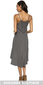 A braided panel adds unique intricacy to this sleek Cleobella dress. The uneven flared skirt lends an asymmetrical touch. Adjustable spaghetti straps. Unlined.