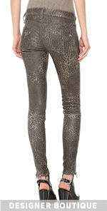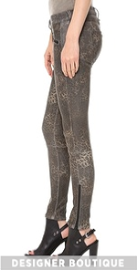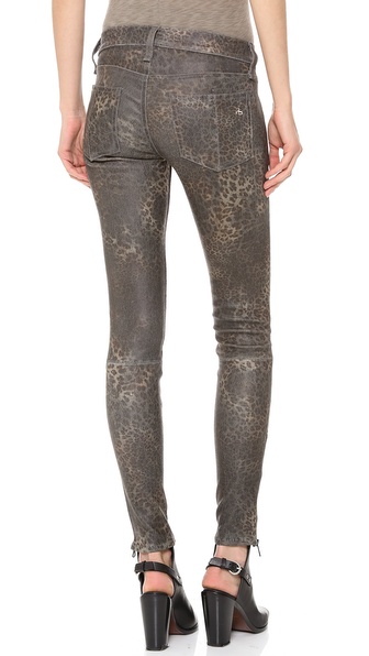 Graphic animal print adds visual interest to Rag & Bone/JEAN pants made from distressed lambskin. Zipper embellishments add an edgy vibe. 5 pocket styling. Button closure and zip fly.