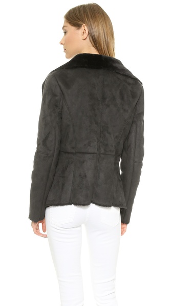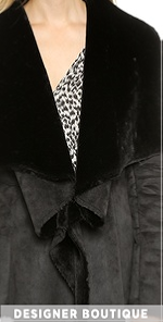 A luxe Velvet jacket made from faux suede and lined with plush faux fur. An oversized shawl collar drapes elegantly into the open placket. Raw edges lend a cool deconstructed finish. An internal drawstring cinches the waist.