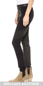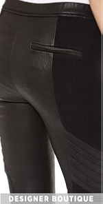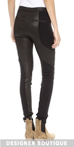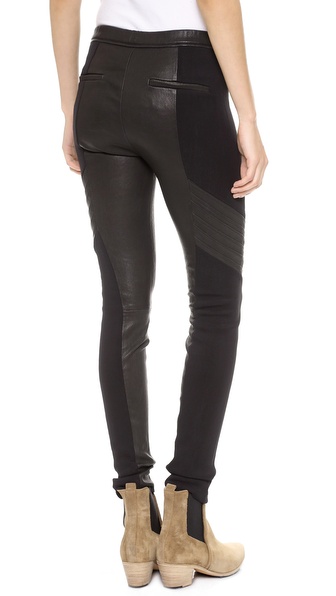 Topstitching complements the moto look of these skinny IRO pants cut in a cool mix of leather and jersey. Welt back pockets. Stretch waist. Faux fly.