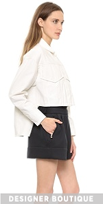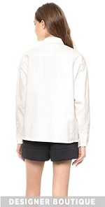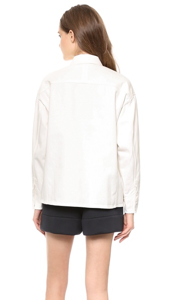 This 3.1 Phillip Lim jean jacket feels modern with a dramatic high-low silhouette. A covered button placket lends a clean look and oversized faux breast pockets offer a playful take on the classic style. Tonal snaps secure the cuffs. Unlined.