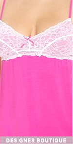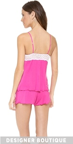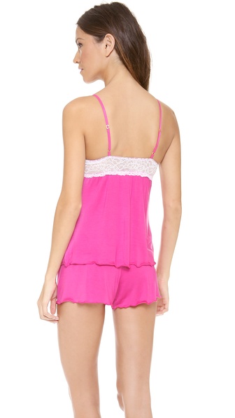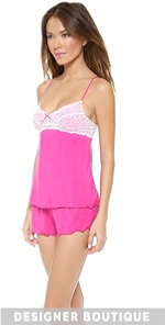 Lace panels add romantic contrast to this jersey pajama set. The camisole and shorts have serged edges and tiny bows for a sweet finish. Adjustable spaghetti straps.