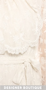 A crinkled chiffon Mes Demoiselles dress feels romantic with a ruched panel accenting the round neckline. Scalloped edges soften the cuffs and hem and a self-belt details the gathered elastic wasit. Long sheer sleeves. Button back closure. Lined.