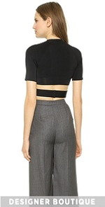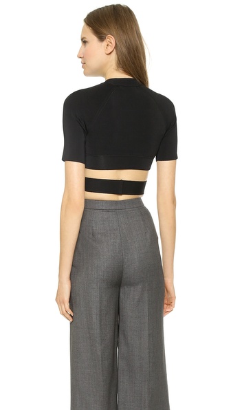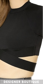 This edgy T by Alexander Wang cropped pullover has a wraparound crisscross hem that connects in back with a hook-and-eye closure. Ribbed crew neckline. Short raglan sleeves.