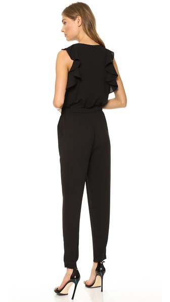 Short flutter sleeves add a girly accent to this slouchy-straight Shoshanna jumpsuit. Pleating brings soft volume to the bodice and covered elastic cinches the waist. Slant hip pockets. Hidden back zip.