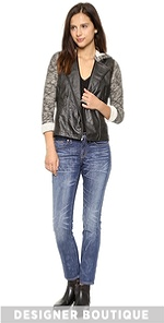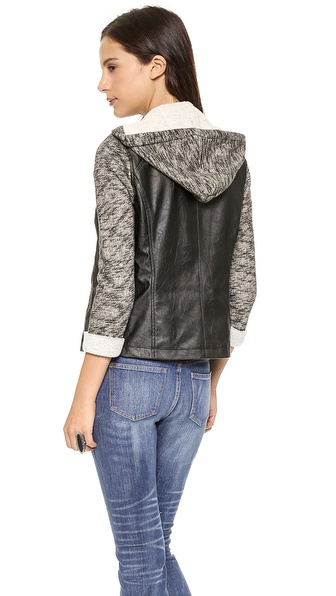 Heathered knit sleeves and a hoodie soften the look of this BB Dakota bomber jacket. An exposed zip and single snap secure the off-center placket and collar. Angled welt pockets. Lined.