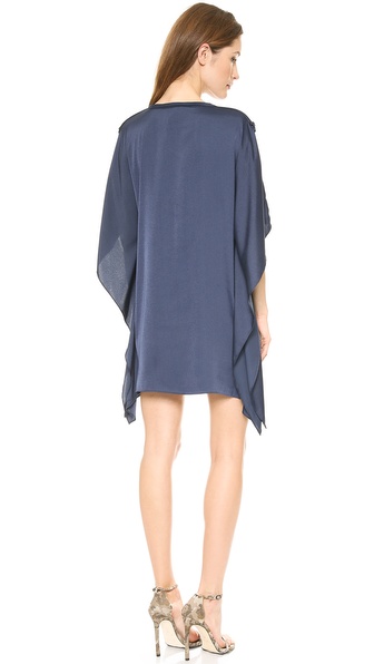 A voluminous cut brings a sense of drama to this BCBGMAXAZRIA dress styled with wide epaulets an a pointed uneven hem. Hook-and-eye keyhole. Short batwing sleeves. Unlined.
