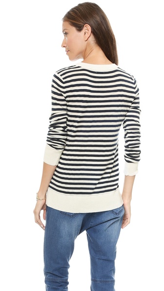 This soft fine-knit Splendid sweater is detailed with stripes and a ribbed V neckline. Long sleeves and ribbed cuffs.
